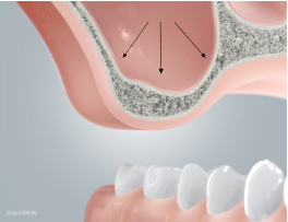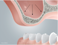 Für eine Implantation muss ausreichend Knochengewebe vorhanden sein. Für den Oberkiefer ergibt sich eine besondere Situation durch die nahe Lage der Kieferhöhle.Nach Zahnverlust verliert nicht nur der Kieferkamm an Knochenhöhe, sondern die Kieferhöhle dehnt sich auf Kosten des Kieferkamms aus (Pfeile). Das Knochenangebot zur Verankerung eines Implantates wird zu gering.